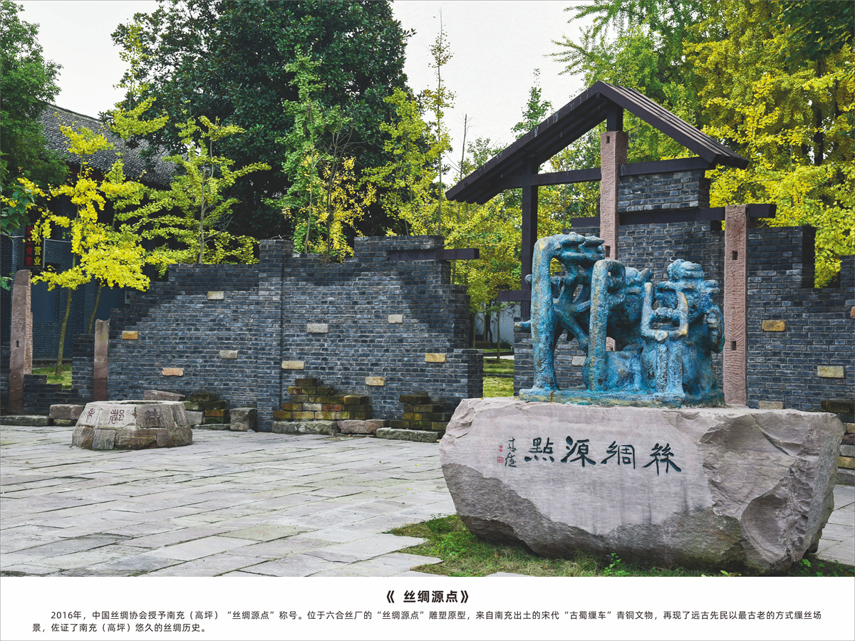 丝绸源点雕塑的造型来自南充出土的一件宋代“古蜀缫车”青铜文物。描绘了远古先民以最古老的方式缫丝的场景,佐证了南充悠久的丝绸历史。